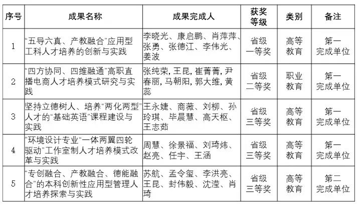 我校管理学院张纯荣、王昆等作为成果完成人的《“四方协同、四维融通”高职直播电商人才培养模式研究与实践》被授予吉林省教学成果奖二等奖(职业教育),填补了我校在省级职业教育成果奖获奖方面的空白;我校外国语学院王永婕、商薇、刘柳、孙玲琪、毕晨慧、高天枢、王志茹作为成果完成人的《坚持立德树人、培养“两化两型” 人才的“基础英语”课程建设与实践》和艺术设计学院周慧、徐景福、刘琦炜、赵亮、任宇等作为成果完成人的《环境设计专业“一体两翼四轮驱动”工作室制人才培养模式改革与实践》被授予吉林省教学成果奖三等奖(高等教育);《“专创融合、产教融合、德能融合”的本科创新性应用型管理人才培养探索与实践》是我校管理学院与其他高校共同完成的成果,被授予吉林省教学成果奖三等奖(高等教育)。