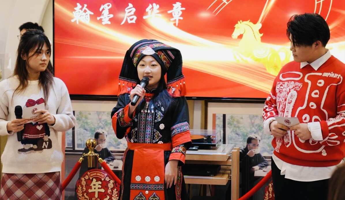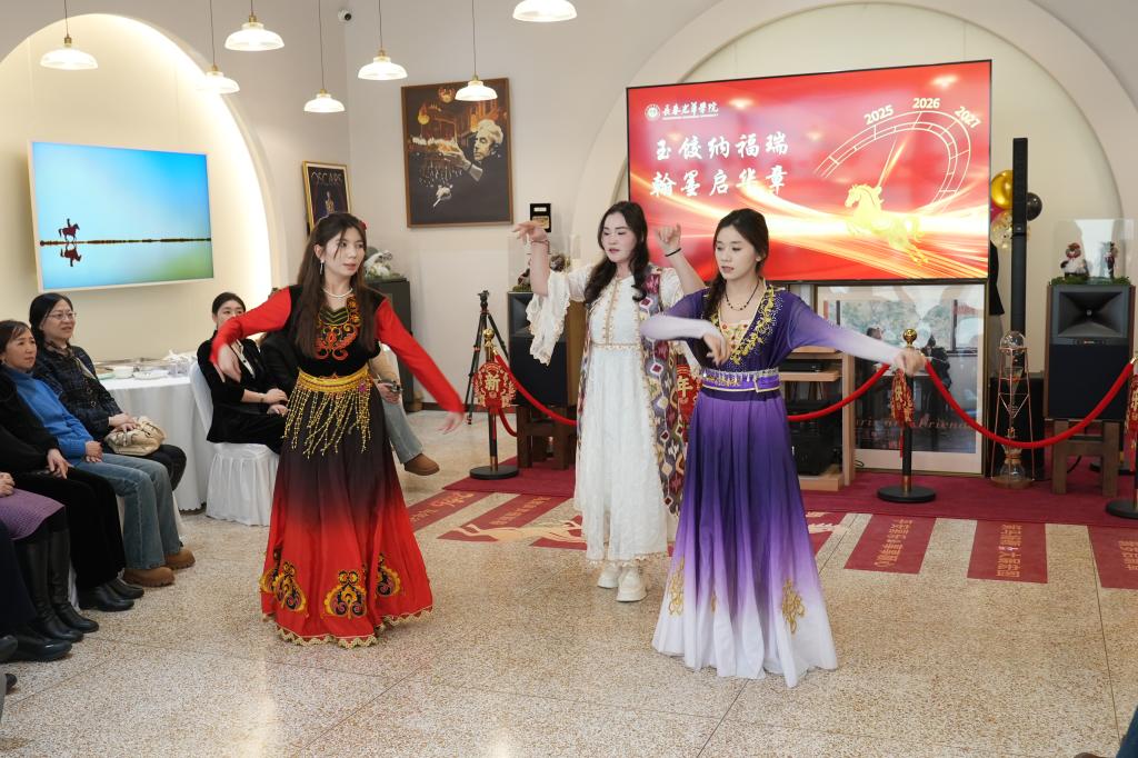 活动在温馨祥和的氛围中拉开序幕。多位影视明星和在校学子通过视频,为学校发展与沐味咖啡送上诚挚祝福;现代教育学院学子奏响悠扬笛声《春节序曲》,婉转旋律勾勒出新年的美好;维吾尔族同学献上翩跹民族舞,灵动舞步尽显多元文化的绚丽风采,瞬间点燃现场氛围。