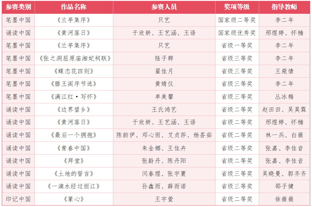 在吉林赛区比赛中,我校参赛作品覆盖“笔墨中国”“诵读中国”“印记中国”三大板块,荣获省赛一等奖1项,二等奖6项,三等奖6项。